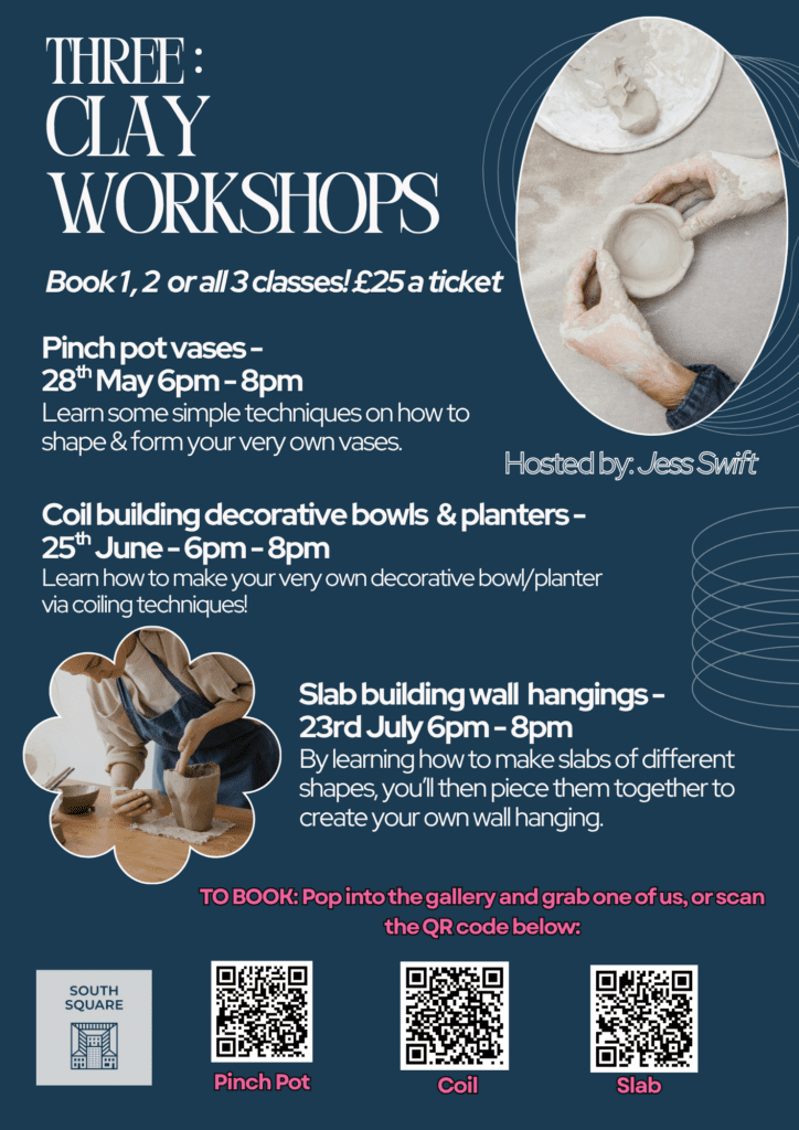We are offering 3 clay workshops all covering different techniques, book one, two or all three! Find more information about the other workshops on our website.
